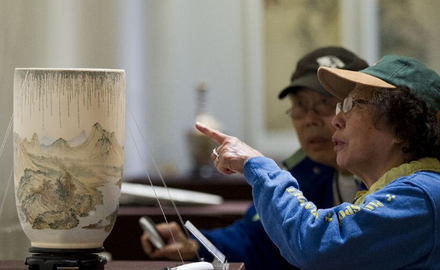 4月28日,觀眾在加拿大多倫多中華文化中心參觀“陶瓷微書”作品。作為2015-2016中國與加拿大文化交流年的一項內(nèi)容,中國國家級非物質(zhì)文化遺產(chǎn)——“陶瓷微書”作品展于4月24日至5月1日在加拿大多倫多舉行,展覽展出了項目傳承人王芝文的數(shù)十件作品?!疤沾晌睂⒅袊鴷ㄋ囆g(shù)與陶瓷藝術(shù)相結(jié)合,在不用任何放大設(shè)備的情況下,運用難度極高的微小文字在瓷器上創(chuàng)作。(鄒崢攝)