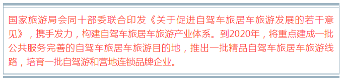 意見提出,到2020年,重點建成一批公共服務(wù)完善的自駕車旅居車旅游目的地,推出一批精品自駕車旅居車旅游線路,培育一批自駕游和營地連鎖品牌企業(yè),增強旅居車產(chǎn)品與使用管理技術(shù)保障能力,形成網(wǎng)絡(luò)化的營地服務(wù)體系和完整的自駕車旅居車旅游產(chǎn)業(yè)鏈條,建成各類自駕車旅居車營地2000個,相關(guān)政策環(huán)境明顯優(yōu)化,產(chǎn)業(yè)規(guī)模快速壯大,發(fā)展質(zhì)量和綜合效益大幅提升,初步構(gòu)建起自駕車旅居車旅游產(chǎn)業(yè)體系。