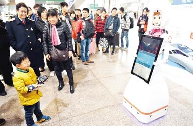 2月1日,一臺名叫“小璐”的智能機(jī)器人亮相廣州南站,吸引了大批旅客的圍觀,大家紛紛嘗試與“小璐”對話,向她咨詢列車時(shí)刻、購票信息、天氣情況等問題,“小璐”不僅可以用甜美的女聲一一作答,還可以在接收到語音指令后,為旅客“唱歌”和“跳舞”。據(jù)了解,使用智能機(jī)器人服務(wù)旅客是廣州南站在今年春運(yùn)中的新嘗試,如果試用效果良好,今后有望在車站中看到更多智能機(jī)器人的身影。圖為一位小朋友嘗試與智能機(jī)器人“小璐”對話。