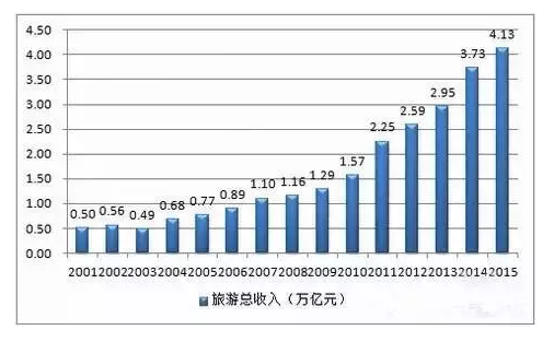 國家統(tǒng)計局發(fā)布的2015年數(shù)據(jù)顯示,在2015年全國10億元以上的在建旅游項目有2057個,50億元以上的在建旅游項目404個,投資額100億元以上的旅游項目185個。比上年增長10.5%;全國旅游總收入約34200億元,比上年增長13.1%。