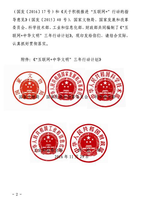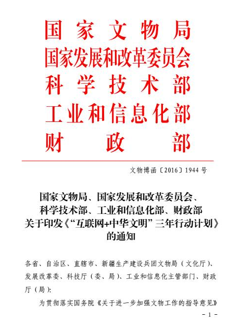 為貫徹落實國務(wù)院《關(guān)于進一步加強文物工作的指導(dǎo)意見》(國發(fā)(2016)17號)和《關(guān)于積極推進“互聯(lián)網(wǎng)+”行動的指導(dǎo)意見》(國發(fā)(2015)40號),國家文物局、國家發(fā)展和改革委員會、科學(xué)技術(shù)部、工業(yè)和信息化部、財政部共同編制了《“互聯(lián)網(wǎng)+中華文明”三年行動計劃》?,F(xiàn)印發(fā)給你們,請結(jié)合實際,認真抓好貫徹落實。