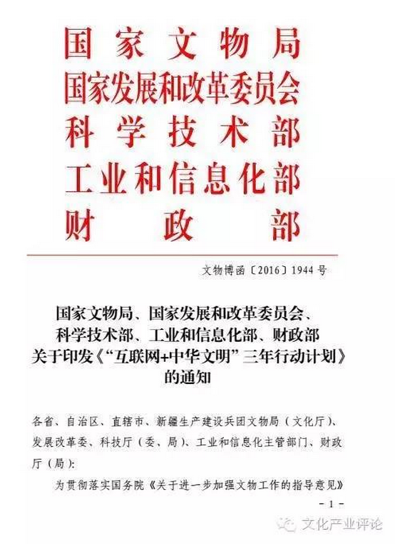 為貫徹落實(shí)國務(wù)院《關(guān)于進(jìn)一步加強(qiáng)文物工作的指導(dǎo)意見》(國發(fā)(2016)17號)和《關(guān)于積極推進(jìn)“互聯(lián)網(wǎng)+”行動的指導(dǎo)意見》(國發(fā)(2015)40號),國家文物局、國家發(fā)展和改革委員會、科學(xué)技術(shù)部、工業(yè)和信息化部、財(cái)政部共同編制了《“互聯(lián)網(wǎng)+中華文明”三年行動計(jì)劃》?!队?jì)劃》提出到 2019 年末,初步構(gòu)建文物信息資源開放共享體系,基本形成授權(quán)經(jīng)營、知識產(chǎn)權(quán)保護(hù)等規(guī)則規(guī)范;樹立一批具有示范性、帶動性和影響力的融合型文化產(chǎn)品和品牌;培養(yǎng)一批高素質(zhì)人才,培育一批具有核心競爭力的文博單位和骨干企業(yè);初步建立政府引導(dǎo)、社會參與、開放協(xié)作、創(chuàng)新活躍的業(yè)態(tài)環(huán)境,擴(kuò)展文物資源的社會服務(wù)功能,為滿足人民群眾多層次、多形式、多樣化的精神文化需求,促進(jìn)文化繁榮和經(jīng)濟(jì)社會發(fā)展做出新的貢獻(xiàn)。