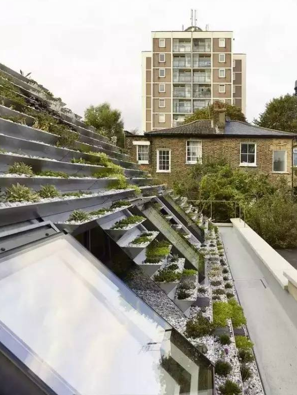 這座住宅位于倫敦哈克尼區(qū),四周多是維多利亞時(shí)期風(fēng)格的建筑。屋頂坡度在30°~45°之間,方便主人爬上爬下,更好地打理這座屋頂上的花園。整個(gè)屋頂上覆蓋了800多株植物,簡直就是一座植物博物館。