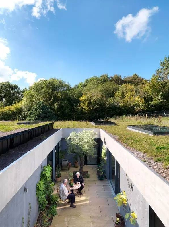 這座英國鄉(xiāng)村住宅是一對(duì)藝術(shù)家的住所和工作室,有著寬闊的草坪屋頂、玻璃圍合的庭院。住宅依偎在地形之中,從北面基本上看不見它。