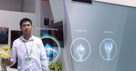 墻面上的鏡子不是一面普通的鏡子,人站到地面上的“電子秤”上后,鏡子上就會顯示人的體重、血壓等多項身體指標,還可以對每一項指標進行歷史信息的查詢,也可以提供實時顯示身體指標狀況的健身項目,它采用了鏡面AR技術。