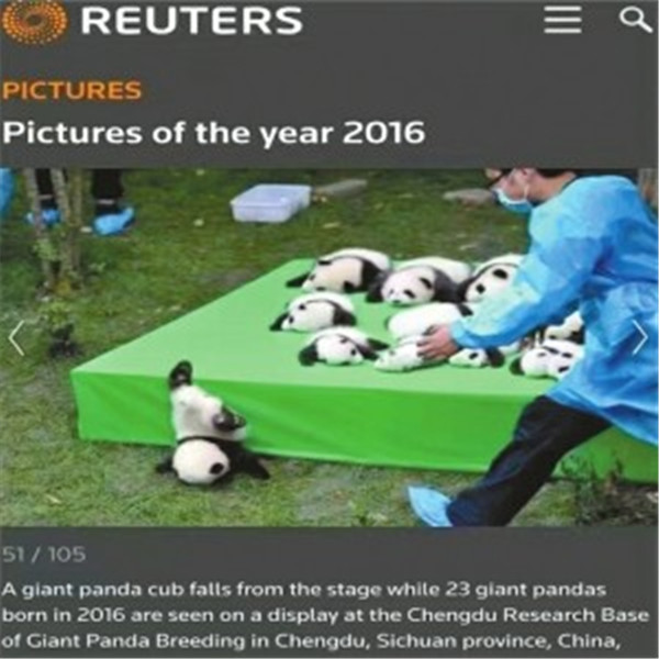 這條消息稱,去年9月,成都大熊貓繁育研究基地內(nèi),2016年度出生的23只大熊貓寶寶,全部被工作人員抱出來(lái)集體亮相,萌態(tài)十足吸引了眾多游客。一只熊貓寶寶不慎從“舞臺(tái)”上摔落,這一幕被攝影師捕捉下來(lái)。該照片入選路透社2016年度圖片,被美國(guó)《時(shí)代周刊》評(píng)為“2016年度動(dòng)物類照片50佳”。