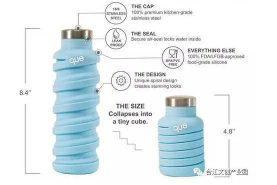 瓶子雖然柔軟但耐熱性也相當好,可承受150度高溫。而官方推薦的使用溫度是60讀,為什么?因為硅膠的隔熱性不好,裝的水太高溫的話會燙到手。設計這個que Bottle的是兩位熱愛旅游的環(huán)保主義人事,目地就是要為了提倡環(huán)保。伸長后三瓶水的量就是一天的喝水量,喜歡探險、爬山或戶外戶外活動的人士不能錯過。