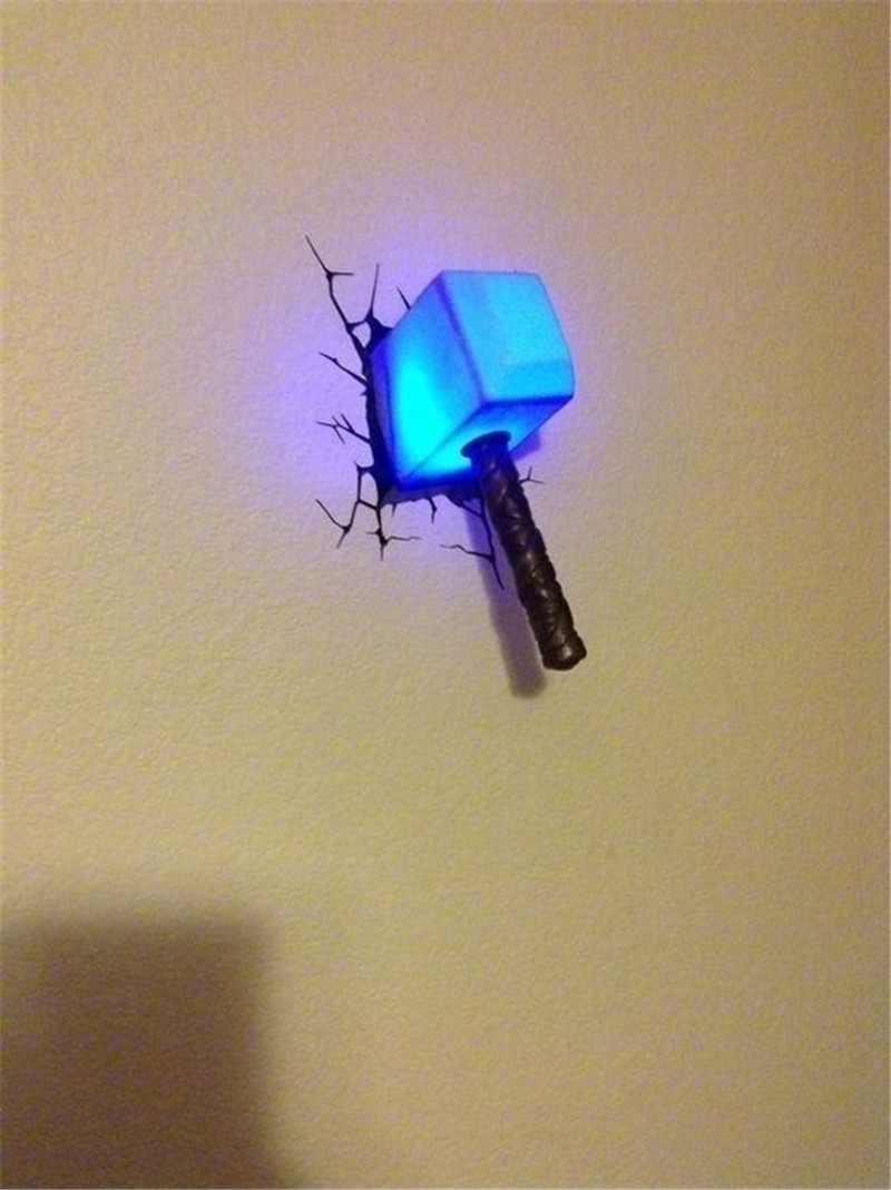 設計者將燈的造型參考了“雷神之錘”,同時巧妙地將錘子仿佛嵌入墻體之中,藍色的燈光像是聚集了什么能量一般,是不是想要拿小燈燈錘你胸口呢。